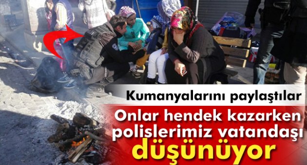 Diyarbakır’ın Sur ilçesinde süren operasyonlarda görev yapan polisler, ilçeden kaçan vatandaşları güvenli bölgeye alarak kumanyalarını paylaştı. Hava şartlarından dolayı üşüyen vatandaşlar, polisin yaktığı ateşle ısındı.