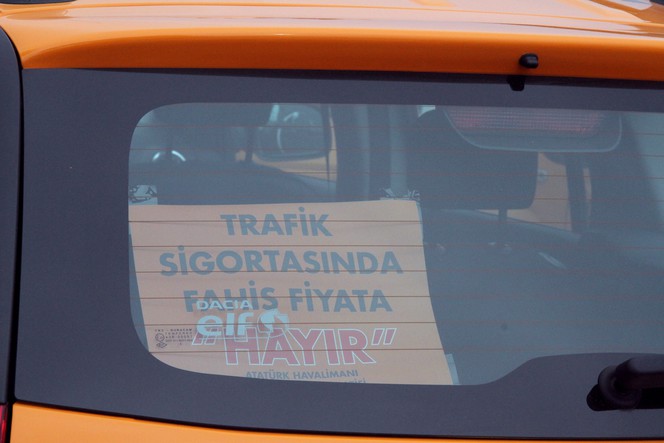 Atatürk Havalimanı Taksiciler Kooperatifi üyeleri trafik sigortasına yapılan zamları protesto etmek için araçlarına ve Taksiciler Kooperatifi binasına “Trafik sigortasındaki fahiş fiyatlara hayır” yazan dövizler yapıştırdı. Para kazanamadıklarını öne süren taksiciler yetkililerden yardım istedi. Trafik sigortası primlerinin normal bir seviyeye indirilmesini istediklerini söyleyen Atatürk Havalimanı Taksiciler Kooperatifi Başkanı Fahrettin Can, “Biz geçen senede bu yüksek ücretlerden zorunlu trafik sigortası adı üzerinde biz bunlardan şikayetçiydik. Eskiden milyonluk araçlar, özel araçlar yani trilyonluk araçlar, dört yüz beş yüz bin lira sigorta poliçesi öderken, biz bin 500 lira ödüyorduk. Şimdi ise özel araçlar bin 500 lira oldu. 4 bin 500, 5 bin hatta 8 bin liraya kadar çıkan primler ödemek zorunda kalıyoruz. En düşük ödemek zorunda kalan arkadaşımız 5 bin 500 lira sigorta pirimi ödemek zorunda kalıyor” dedi.