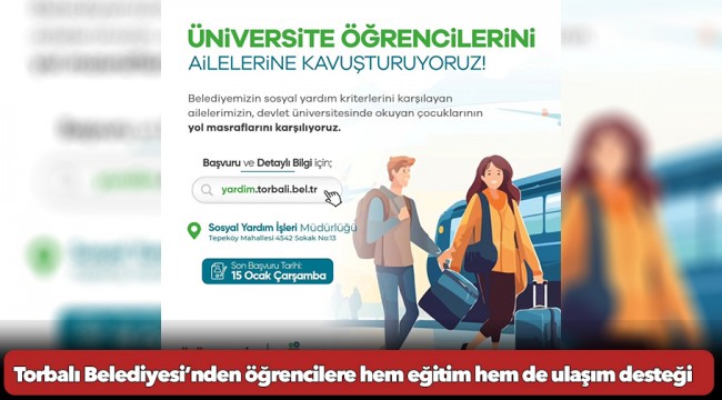 Her fırsatta gençlerin yanında olan ve hayata kazandırdığı projeler ile gençlerin geleceğe en iyi şekilde hazırlanmasını sağlayan Torbalı Belediye Başkanı Övünç Demir, üniversite öğrencilerine can suyu olacak. Torbalı Belediyesi, bu kapsamda ilçede ikamet eden ve sosyal yardım kriterlerine uyan 17-25 yaş arası üniversitede okuyan gençlere eğitim desteği sağlayacak. Torbalı Belediyesi eğitim desteğinin yanı sıra üniversite öğrencilerini ailelerine kavuşturacak. Kriterlere uyan gençlerin yol masraflarını karşılayacak olan Torbalı Belediyesi, başvuruları almaya başladı. Başvuruların 15 Ocak tarihine kadar devam edeceği belirtilirken, başvurular ise Sosyal Yardım İşleri Müdürlüğü’ne ve yardim.torbali.bel.tr adresi üzerinden yapılacağı açıklandı.