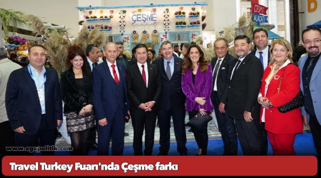 Fuarda bu yıl da açtığı özgün standıyla fark yaratan Çeşme standını yüzlerce kişi ziyaret etti. Travel Turkey’de yoğun ilgi çeken Çeşme standına gelen konukları, Çeşme Belediye Başkanı M. Ekrem Oran’ın yanı sıra, Çeşme Kaymakamı Mehmet Maraşlı, ÇEŞTOB Başkanı Yakup Demir karşıladı. Alaçatı sokaklarına renk katan begonviller, Çeşme standını da renklendirirken, Çeşme limonu fidanları da stantta yer aldı.