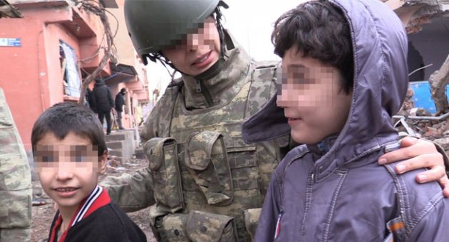 Diyarbakır'ın Sur ilçesinde 4 kişilik bir aile, 47 gün sonra polis ve askerin ortak operasyonuyla rehin olmaktan kurtarıldı. Teröristlerin bölgeden çıkmasına izin vermediği ailenin güvenli bölgeye sevk edildiği operasyonda Türk Silahlı Kuvvetleri bünyesinde görev yapan bir kadın astsubay da yer aldı. Terör mağduru minik aile bireyleriyle yakından ilgilenen kadın komutan, çocuklarla yol boyunca sohbet etti. Şefkat elini miniklerin omuzlarına atan astsubay, teröristlerin yakması sonucu kullanılamaz hale gelen evlerin arasında sevgi mesajı verdi.