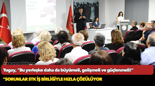 Karşıyaka’nın duyarlılık açısından çok farklı bir kent olduğunu ifade eden Dr. Cemil Tugay, sözlerini şöyle sonlandırdı: “Karşıyakalılar eğitimli, bilinçli, örgütlenmeye yatkın insanlar. O nedenle 500’den fazla STK’sı olan bir ilçeyiz. Çok çeşitli alanlarda çalışıyorlar. Bunu başka kentlerde çok az görebilirsiniz. Biz STK’ları destekleyecek bir yapı oluşturursak bu nereye gider diye düşündük. Birbirinden uzak ve temas kurmayan STK’ların iletişimi güçlenirse daha faydalı çalışmalar olur, yeni güçler oluşur, belediye bu iş birliğinde yapıcı davranır ve üzerine düşeni yaparsa başarı artar dedik. Bir yıl sonunda bunu gördük. Yerleşkemizin, Türkiye’nin örnek STK yerleşkesi olma görevini üstleneceğini düşünüyorum. Bu dönem ya da başka bir dönem, bu yerleşke daha da büyümeli, gelişmeli ve güçlenmeli. Sivil Toplum Kuruluşları, daha aktif, daha etkin, toplum adına daha yüksek ses çıkaran, çözüm üreten, yanlış yapana dur diyen, doğru yapana alkış tutan bir güç olmalı. Bir kentin geleceğinde sivil dinamiklerin önemini biliyor ve onlarla birlikte yol yürümekten güç alıyoruz.”