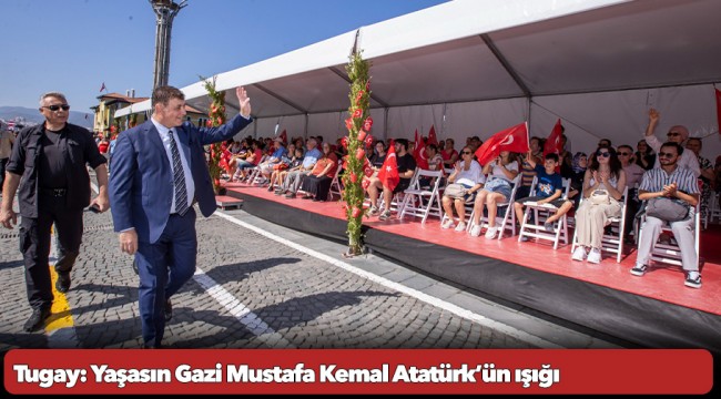“Mustafa Kemal’in askerleriyiz” sloganlarıyla kürsüye çıkan İzmir Büyükşehir Belediye Başkanı Dr. Cemil Tugay, “İzmir, 9 Eylül demek. 9 Eylül İzmir demek. İzmir Kurtuluş Savaşı’nın ateşinin yakıldığı şehir demek. 9 Eylül’de İzmir’de elde edilen o zafer, aynı zamanda Türkiye’mizin, Cumhuriyetimizin yazılışı demek, önsözü demek. Böylesine özel bir günü 102 yıldır kutluyoruz. Bugünün ne kadar özel, ne kadar onurlu bir gün olduğunu anlatmaya kelimeler yetmiyor” dedi.