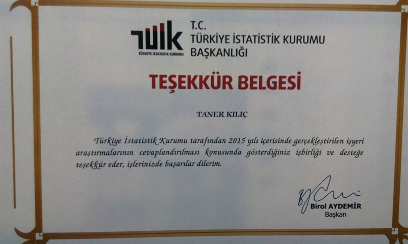 TÜİK Başkanı Birol Aydemir imzalı belgede ‘Türkiye İstatistik Kurumu tarafından 2015 yılı içerisinde gerçekleştirilen işyeri araştırmalarının cevaplandırılması konusunda gösterdiğiniz işbirliği ve desteğe teşekkür eder, işlerinizde başarılar dilerim” ifadeleri yer aldı.