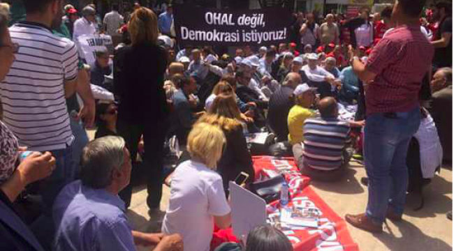 CHP'nin, OHAL Değil Demokrasi İstiyoruz çağrısına EMEKLİSEN ülke genelindeki şubeleriyle tam destek vererek basın açıklamalarının ardından oturma eylemine katıldı.