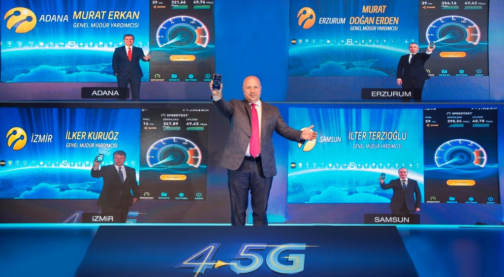 Turkcell, Marmara’da İstanbul, Doğu Anadolu’da Erzurum, Karadeniz’de Samsun, Akdeniz’de Adana, Ege’de ise İzmir’de düzenlediği eş zamanlı basın toplantıları ile 1 Nisan 2016 için hazır hale getirdiği 4.5G şebekesini test etti. Toplantıları İstanbul’dan koordine eden Turkcell Genel Müdürü Kaan Terzioğlu, Türkiye’nin 4 tarafına dağılan Turkcell genel müdür yardımcılarına 4.5G ile bağlandı ve bu illerde gerçekleştirilen hız testlerini İstanbul’dan izledi.