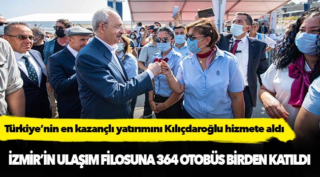 Ülke genelinde tek seferde en büyük otobüs alımına imza atan İzmir Büyükşehir Belediyesi, 570 milyon liralık yatırımla satın aldığı 160'ı körüklü, 204'ü solo olmak üzere toplam 364 yerli üretim otobüsü, CHP Lideri Kemal Kılıçdaroğlu’nun katıldığı törenle hizmete aldı. Fuar İzmir’deki tarihi törende, araçların bir bölümüyle İzmir’in simgesi Saat Kulesi figürü oluşturuldu ve altına da yine otobüslerle “Aşkla Türkiye” yazıldı. Törende konuşan CHP Lideri Kemal Kılıçdaroğlu “İzmir’in içinde çiçekler açıyor. Bunları yapan da İzmir Büyükşehir Belediye Başkanı Tunç Soyer. İzmirlilere hizmet verdiği için ona teşekkür ediyorum. Bugün dört ayrı açılış yaptık. 1 milyar liranın üzerinde toplam yatırım bedeli var. Yani 1 milyar liranın üzerinde yatırımı Başkan Tunç Soyer İzmirlilerin hizmetini sundu. Son derece mutluyum. Başkan tarımdan ulaşıma kadar her alanda çaba harcıyor. 364 otobüsü bir seferde alıp İzmirlilerin hizmetine sunmak, alım için yapılan anlaşmayla sağlanan 242 milyon liralık tasarrufu da İzmirliler ile paylaşmak yurttaşa hesap vermek demektir. Belediye başkanlarımızın en temel özelliği hesap vermektir. Harcadığı her kuruş onların parası değil, sizin paranızdır” dedi.