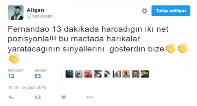 Ali Şan sosyal medya hesabından yaptığı paylaşımla Fenerbahçeli Fernandao’ya adeta isyan etti. Ünlü sanatçı, Spor Toto Süper Lig’de oynanan Antalyaspor-Fenerbahçe maçında kaçırdığı pozisyonlar sonrası, “Fernandao 13 dakıkada harcadığın iki net pozisyonla!!! bu maçta da harikalar yaratacağının sinyallerini gösterdin bize” diyerek, golcü futbolcuya tepki gösterdi.
