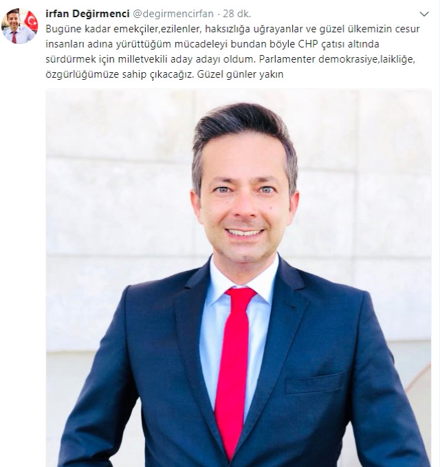 Kanal D'nin eski sunucu İrfan Değirmenci CHP'den aday oldu. Adaylığını sosyal medyadan açıklayan Değirmenci "Bugüne kadar emekçiler,ezilenler, haksızlığa uğrayanlar ve güzel ülkemizin cesur insanları adına yürüttüğüm mücadeleyi bundan böyle CHP çatısı altında sürdürmek için milletvekili aday adayı oldum. Parlamenter demokrasiye,laikliğe, özgürlüğümüze sahip çıkacağız. Güzel günler yakın" ifadelerini kullandı.