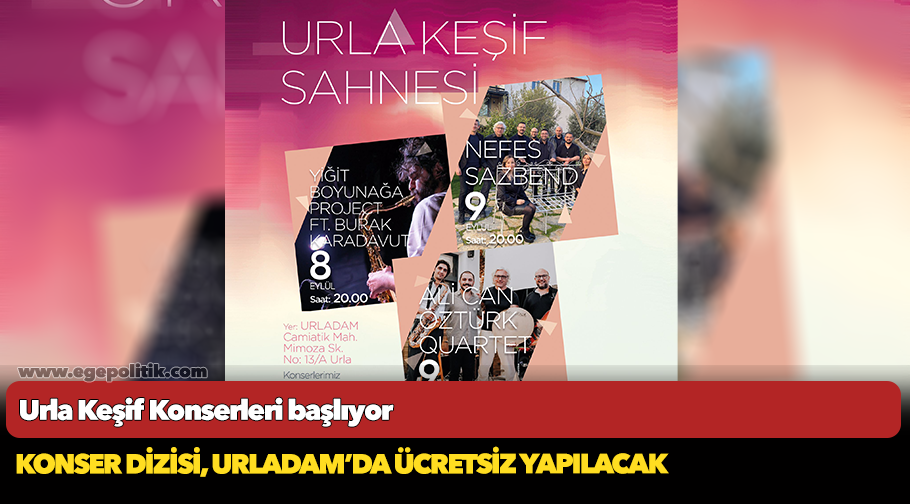 İzmir Büyükşehir Belediyesi’nin düzenlediği "Urla Keşif Konserleri”, Urla'nın eşsiz atmosferini müziğin büyüsüyle birleştirecek. 8-9-15-16 Eylül tarihlerinde ücretsiz olarak Urladam’da yapılacak konserlerde altı farklı performans müzikseverlere unutulmaz anlar yaşatacak. Bu akşam 20.00’de Yiğit Boyunağa Project ft. Burak Karadavut ile başlayacak konser dizisi 9 Eylül saat 20.00’de Nefes Sazbend, 9 Eylül 21.30’da Ali Can Öztürk Quartet, 15 Eylül 19.30’da Zeytin Gölgesi ve 21.00’de Çalgiya İzmir, 16 Eylül 20.00’de Serhan Erkol “Space Walk” Live Set ile sürecek.