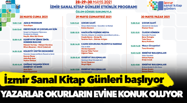 İzmir Büyükşehir Belediye Başkanı Tunç Soyer’in kültürel devamlılık ilkesi doğrultusunda Kültür ve Sanat Dairesi Başkanlığı, İZFAŞ işbirliği, Yayıncılar Kooperatifi ve İstanbul Kitapçısı desteğiyle ilk kez İzmir Sanal Kitap Günleri’ni düzenliyor. Kitapseverleri sanal ortamda buluşturacak etkinlik, 28 – 30 Mayıs tarihleri arasında yapılacak. Yazarlar ile okurlar www.izmirsanalkitapgunleri.com adresinde buluşacak. Binlerce kitap, birçok yayınevi, önemli yazarlar bu üç günlük süreçte okurlarla bir araya gelecek.