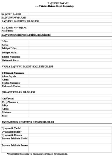 Uyuşmazlıklarla ilgili başvuru, uyuşmazlık konusunu içeren dilekçenin, varsa delil oluşturan ilgili belgelerle birlikte THH.ne verilmesiyle yapılır. THH.ne yapılacak başvurularda Bakanlığın internet sayfasında yer alan başvuru formu kullanılarak yapılabilir. https://tuketici.gtb.gov.tr/data/598dbdfc1a79f54410c617be/basvuru_formu.pdf Başvuru formu kullanılmadan yapılan başvurularda; başvuru sahibinin adı, soyadı, TC kimlik numarası, adresi ve varsa diğer iletişim bilgileri, talebi ve TL cinsinden uyuşmazlık değeri ile şikayet edilene ilişkin bilgilere yer verilmesi zorunludur. Uyuşmazlık değerinin döviz cinsinden olması durumunda, söz konusu değer başvuru tarihindeki TCMB.nın belirlediği efektif döviz satış kuru esas alınarak TL.na çevrilir.