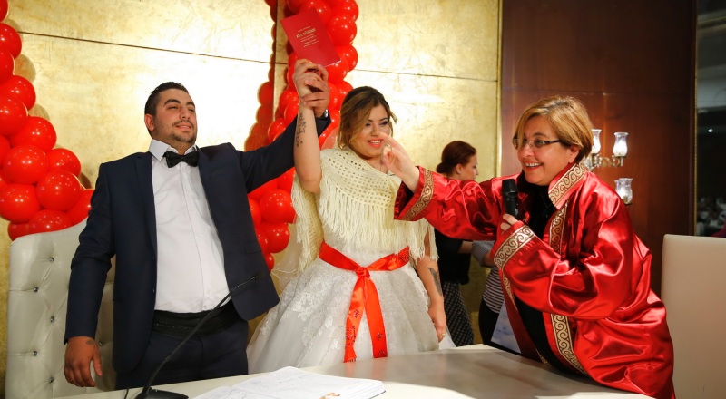 Toplu nikah töreninde 20 yıllık evliklerinin ardından ayrılan ancak uzun süre nikahsız yaşayan Belkıs Kaya ve Ethem Süren çifti de nikah kıydı. Çocukları ve torunlarının da izleyiciler arasında yerini aldığı Süren çifti, ikinci baharlarını attıkları imzalarla taçlandırdı. Toplu nikah töreni için özel olarak süslenen salonda, çiftlerin nikahlarının tamamlanmasının ardından 5 katlı nikah pastası hep birlikte kesildi. Yılbaşı öncesi birbirlerine en güzel hediyeyi resmi nikah kıyarak veren çiftler yeni yıla evli girmenin mutluluğunu yakınlarıyla paylaştı.