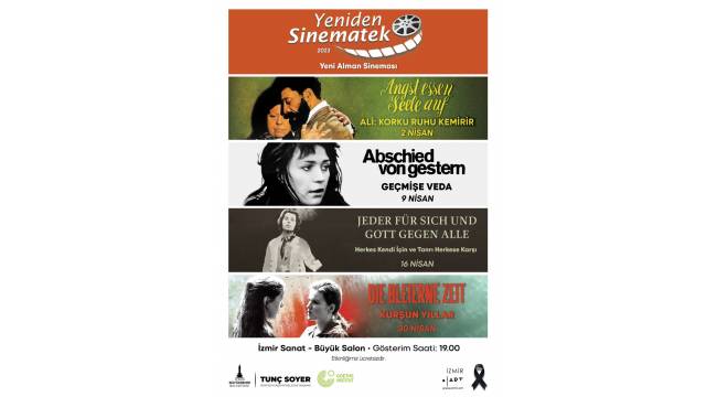 İzmir Büyükşehir Belediyesi “Yeniden Sinematek” gösterimlerinde Nisan ayında “Yeni Alman Sineması” temasıyla dört filmi İzmirli sinemaseverlerle buluşturacak. Rainer Werner Fassbinder’nin “Ali: Korku Ruhu Kemirir”, Alexander Kluge’nin “Geçmişe Veda”, Werner Herzog’un “Herkes Kendi İçin ve Tanrı Herkese Karşı” ve Margarethe von Trotta’nın “Kurşun Yıllar” filmleri izleyenlere unutulmayacak anlar yaşatacak. Filmler, Kültürpark İzmir Sanat ve Seferihisar Kültür Merkezi’nde ücretsiz gösterilecek.