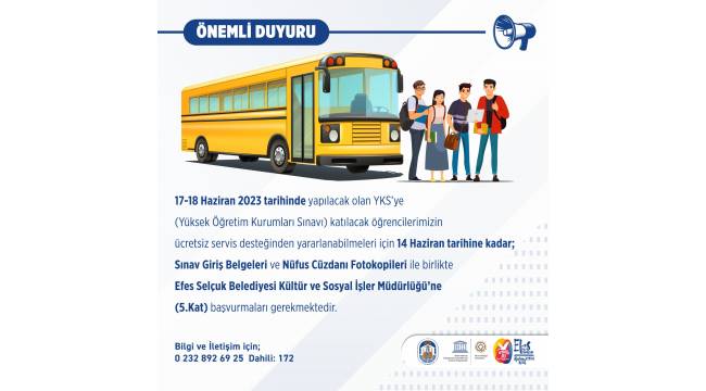17-18 Haziran tarihlerinde yapılacak YKS’ye girecek Efes Selçuklu öğrenciler sınav için ücretsiz ulaşım desteğinden yararlanmak için 14 Haziran Çarşamba gününe kadar sınav giriş belgesi ve nüfus cüzdanı fotokopileriyle Kültür ve Sosyal İşler Müdürlüğü’ne başvurarak ücretsiz ulaşım desteğinden yararlanabilecek. Ulaşım desteği için 0232 892 69 25- 172 numaralı telefondan bilgi alınabilecek.