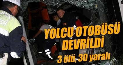 yağmur nedeniyle kayganlaşan yolda, kontrolden çıkan yolcu otobüsünün şarampole devrilmesi sonucu 3 kişi öldü, 5'i ağır, 30 kişi de yaralandı.