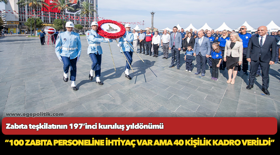 İzmir’de Zabıta Teşkilatı’nın 197’nci kuruluş yıl dönümü nedeniyle Cumhuriyet Meydanı’nda tören düzenlendi. Törene İzmir Büyükşehir Belediye Başkanı Tunç Soyer, İzmir Büyükşehir Belediyesi Genel Sekreteri Barış Karcı, İzmir Büyükşehir Belediyesi Genel Sekreter Yardımcısı Şükran Nurlu, İzmir Büyükşehir Belediyesi Zabıta Dairesi Başkanı Gökhan Daca ile sendika temsilcileri ve zabıta personeli katıldı. Başkan Soyer, zabıta memurlarından Ramazan Öztürk’ün kızı 7 yaşındaki Ayşe Öykü Öztürk ve yine zabıta memuru Deniz Karabacak’ın oğlu 4 yaşındaki Ali Karabacak ile Atatürk Anıtı’na çelenk bıraktı.