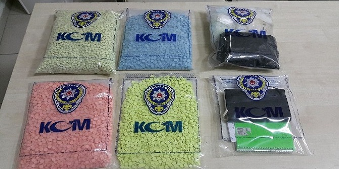 Yapılan teknik ve fiziki takibin ardından söz konusu adrese polis ekipleri baskın yaptı. İki şüpheli şahsın evden çıkma anında yakalayan ekipler, şüpheli İ.P.’nin üzerinden uyuşturucu madde satışından elde edildiği değerlendirilen 4 bin 950 TL para ile yakalandı. Adreslerde yapılan aramalarda ise şüphelilerin banyo ve tuvaletlerin asma tavanlarının arasına sakladıkları yaklaşık 2 bin 500 gram esrar maddesi, değişik renk ve şekillerde toplamda 17 bin adet ecstasy sentetik uyuşturucu haplar, uyuşturucu madde ticaretine yönelik uyuşturucu ve para alışverişlerinin not edildiği 2 adet not defteri ele geçirildi.