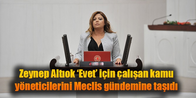 CHP Genel Başkan Yardımcısı ve İzmir Milletvekili Zeynep Altıok, referandum sürecinde ‘Evet’ propagandası için çalışan kamu yöneticilerini Meclis gündemine taşıdı. Altıok, Başbakan Binali Yıldırım’ın yanıtlaması istemiyle hazırladığı yazılı soru önergesinde “Referandum sath-ı mailine girdiğimiz gündem beri devlet olanaklarının sınırsız bir biçimde iktidar partisinin hizmetine sunulmuş durumdadır. Cumhurbaşkanı gerçekleştirdiği açılış törenlerini birer ‘evet’ mitingine çevirirken, Adalet Bakanı’nın referandum odaklı yurtdışı ziyaretinin bile Başbakanlık uçağı ile gerçekleştirildiğini görüyoruz. Valiler, kaymakamlar, il ve ilçelerin kamu yöneticileri, üniversitelerin, kısaca tüm kamu yönetiminin ‘evet’ propagandasına kendilerine adamış birer iktidar partisi milisi gibi davrandığına tanıklık ediyoruz.” ifadelerini kullandı.